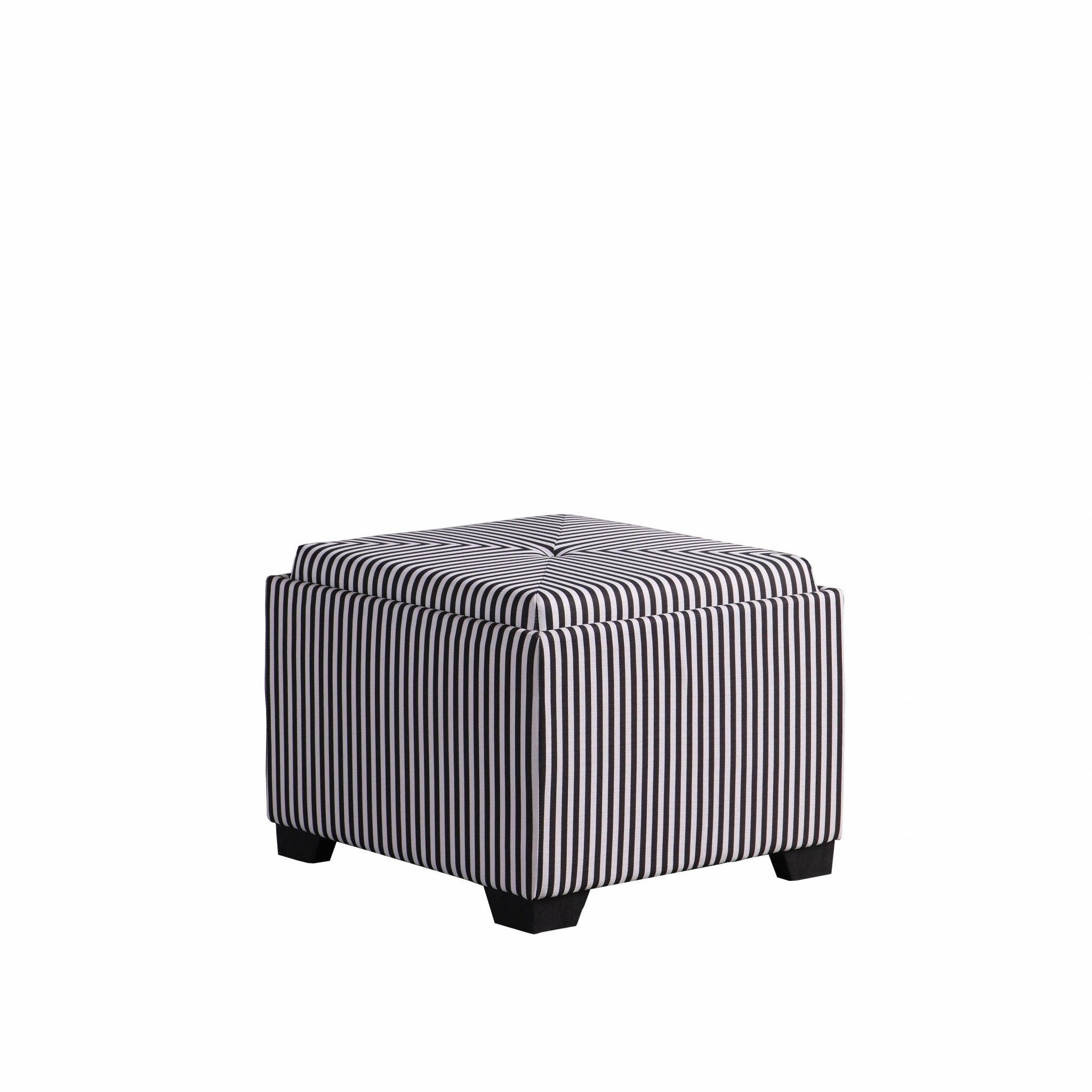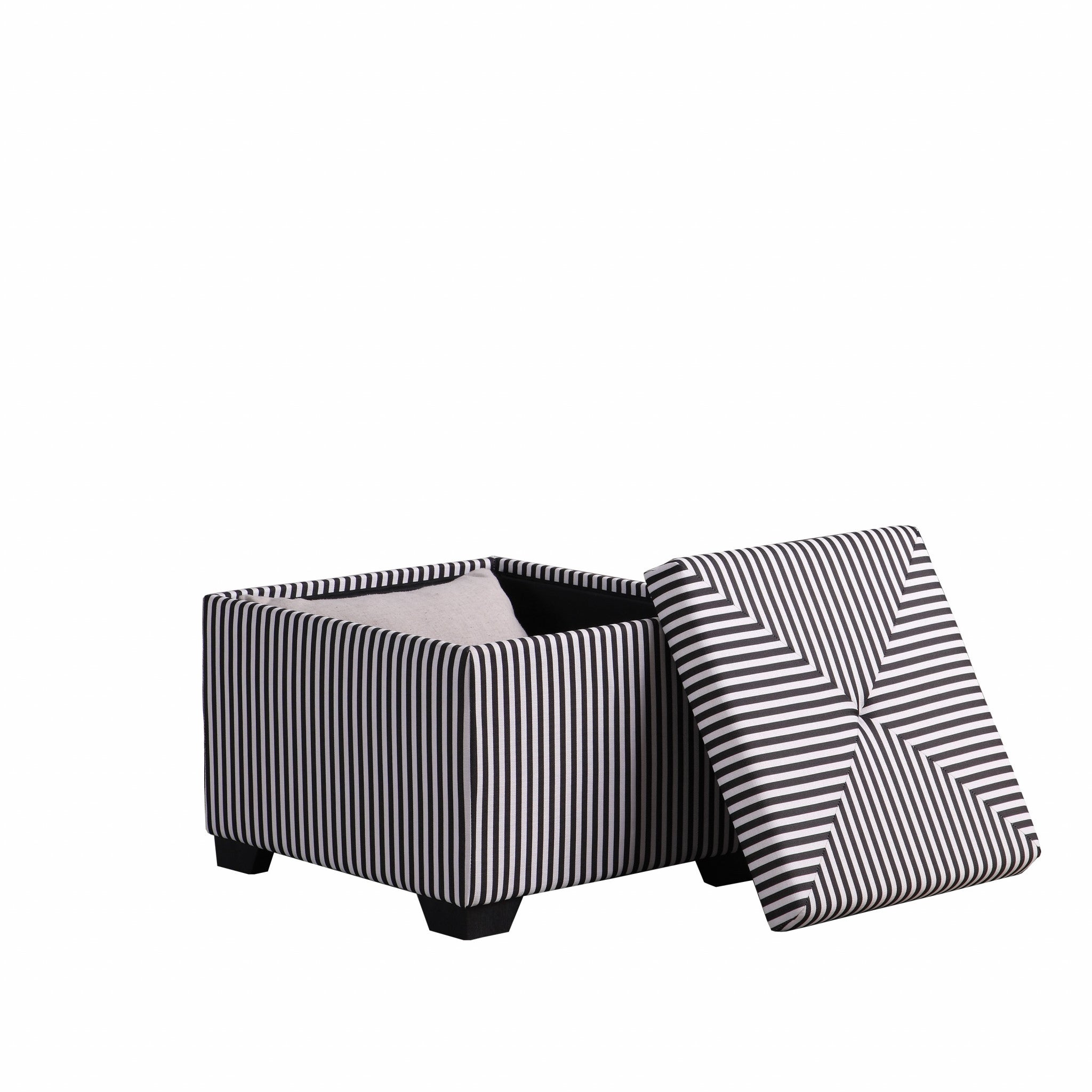 Go to the shopCharming and casually elegant, the Black and White Pinstripes Tufted Storage Ottoman is a versatile piece for your living room, bedroom, playroom or family room. It features hidden storage space and is masterfully upholstered with a classical single tufted seat in a fresh and updated pinstripe pattern. The dark wood finish feet give this piece a modern flair. A stylish and fashionable way to add seating and storage to your space. 17.5" x 22" x 22".
